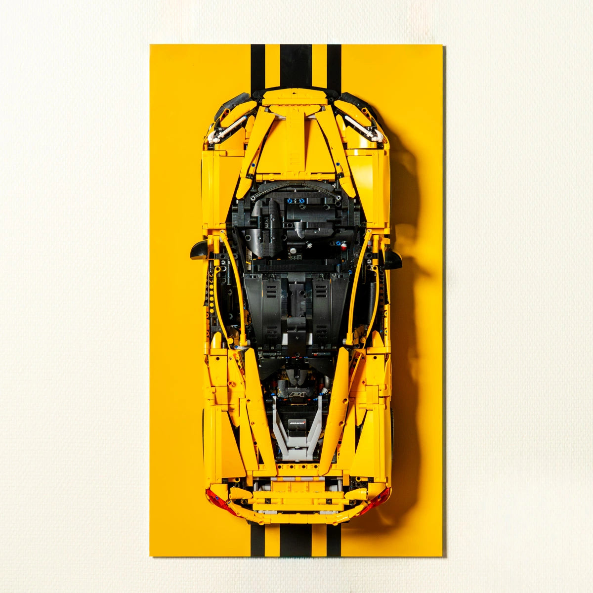Transformeer je LEGO McLaren P1 van bouwproject naar eyecatcher met een geel display frame dat ruimte bespaart en dagelijks laat zien waar je passie ligt.