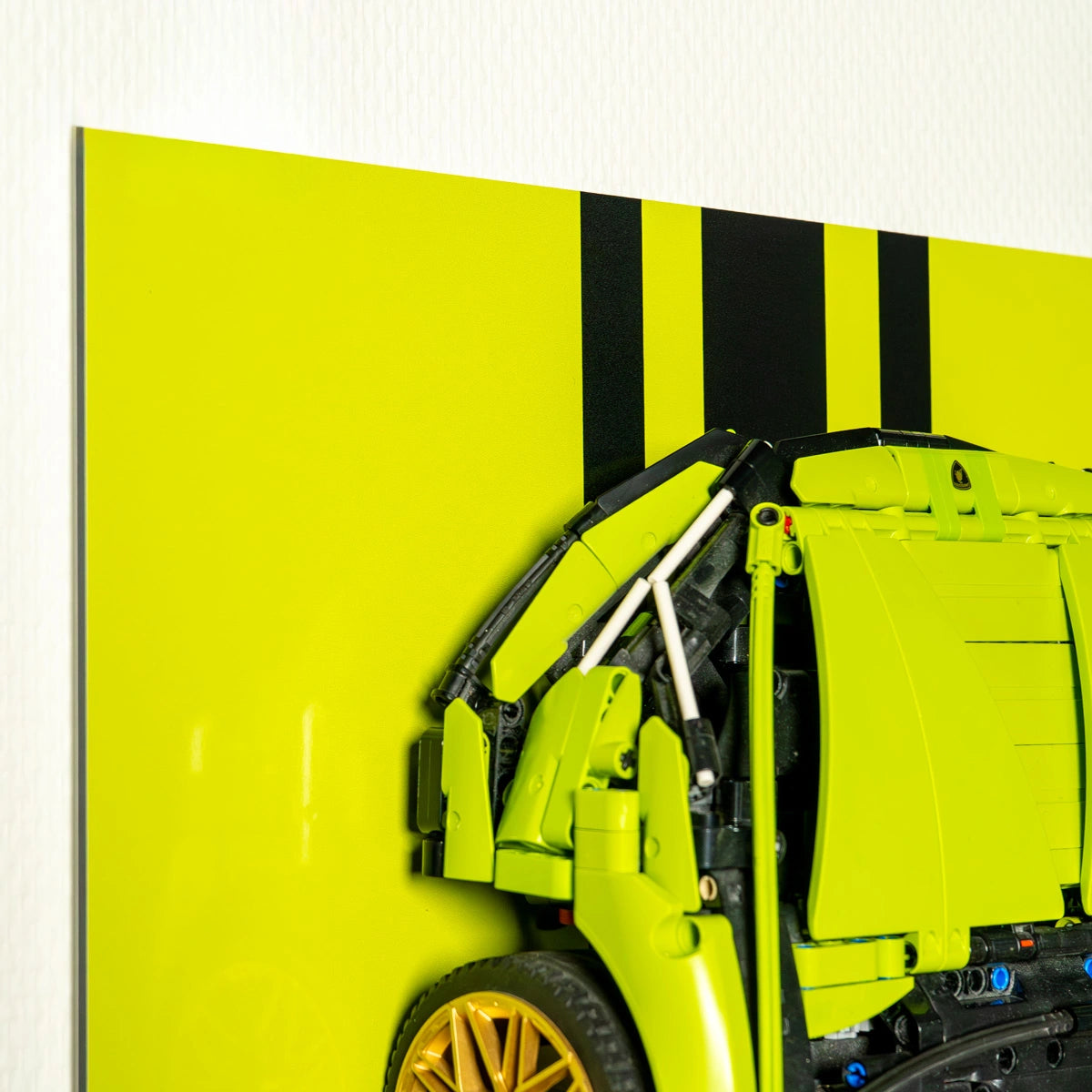 Dit display frame in groen met zwart is perfect afgestemd op de iconische kleuren van de Lamborghini Sián FKP 37 en biedt je LEGO Technic set 42115 de presentatie die het verdient. Het frame bestaat uit twee stevige aluminium platen met daartussen een beschermende kunststof laag, waardoor je schaalmodel veilig aan de muur hangt en optimaal beschermd blijft tegen stof en beschadiging. De Sián is Lamborghini's eerste hybride supercar en combineert V12-kracht met elektrische technologie, en met dit wanddisplay breng je die innovatie naar je eigen ruimte.