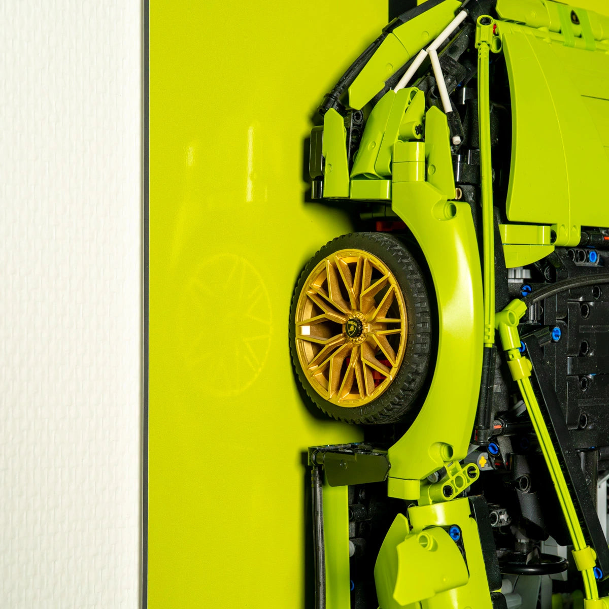 Door je LEGO Lamborghini aan de muur te monteren maak je direct waardevolle ruimte vrij op je bureau, vitrinekast of plank. Het display heeft afmetingen van 40 centimeter breed, 70 centimeter hoog en een plaatdikte van 0,4 centimeter, waardoor het in vrijwel elke ruimte past zonder te veel plaats in te nemen. De groene kleur met zwarte accenten weerspiegelt de sportieve uitstraling van deze bijzondere hypercar en zorgt ervoor dat je bouwwerk direct opvalt.
