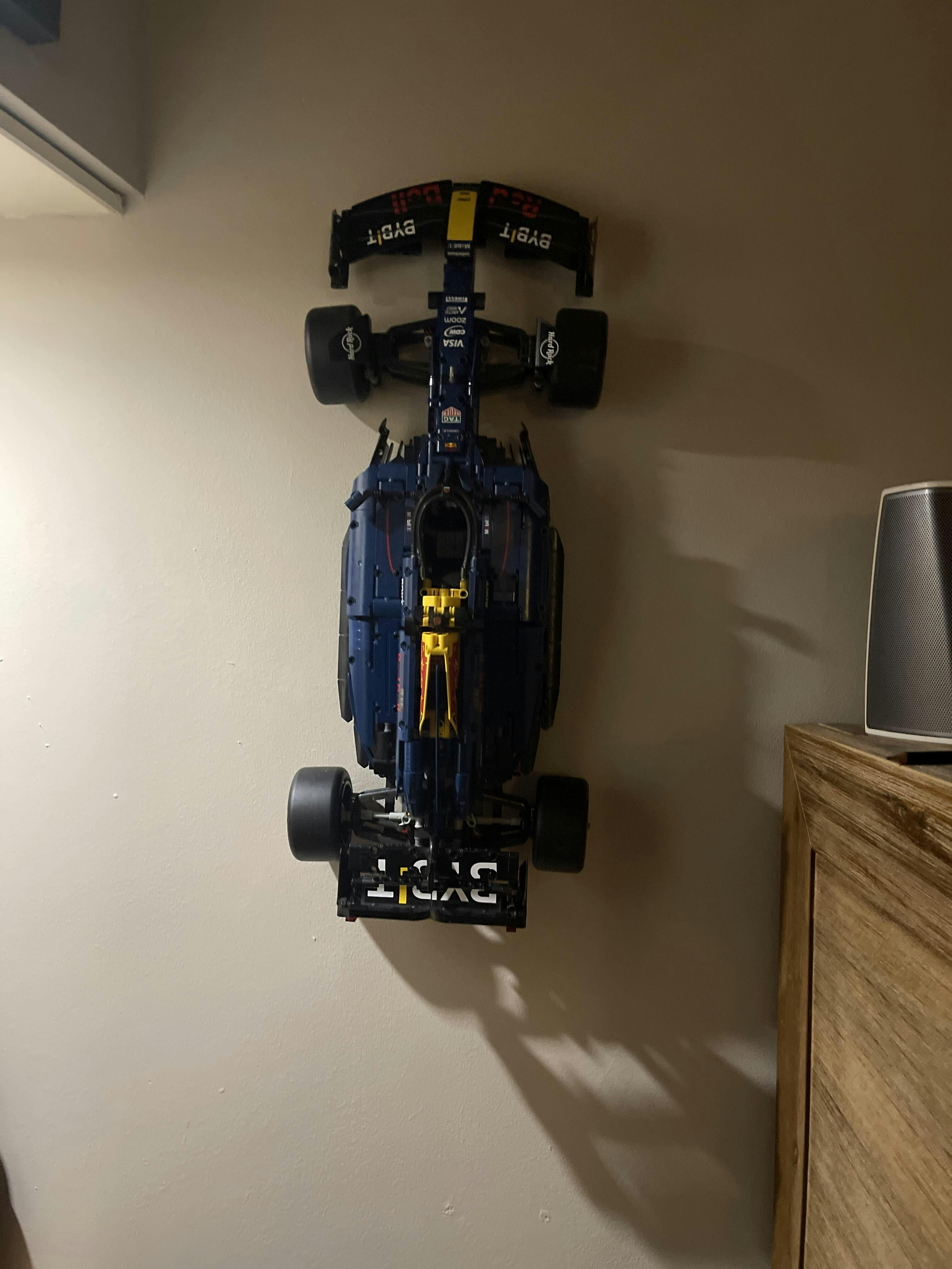 Carefully place the LEGO Oracle Red Bull Racing RB20 F1 on the stand, ensuring it's securely in place. Now your Red Bull racing car hangs in style on your wall, just like Max Verstappen pushes his car to the limit on the racetrack.