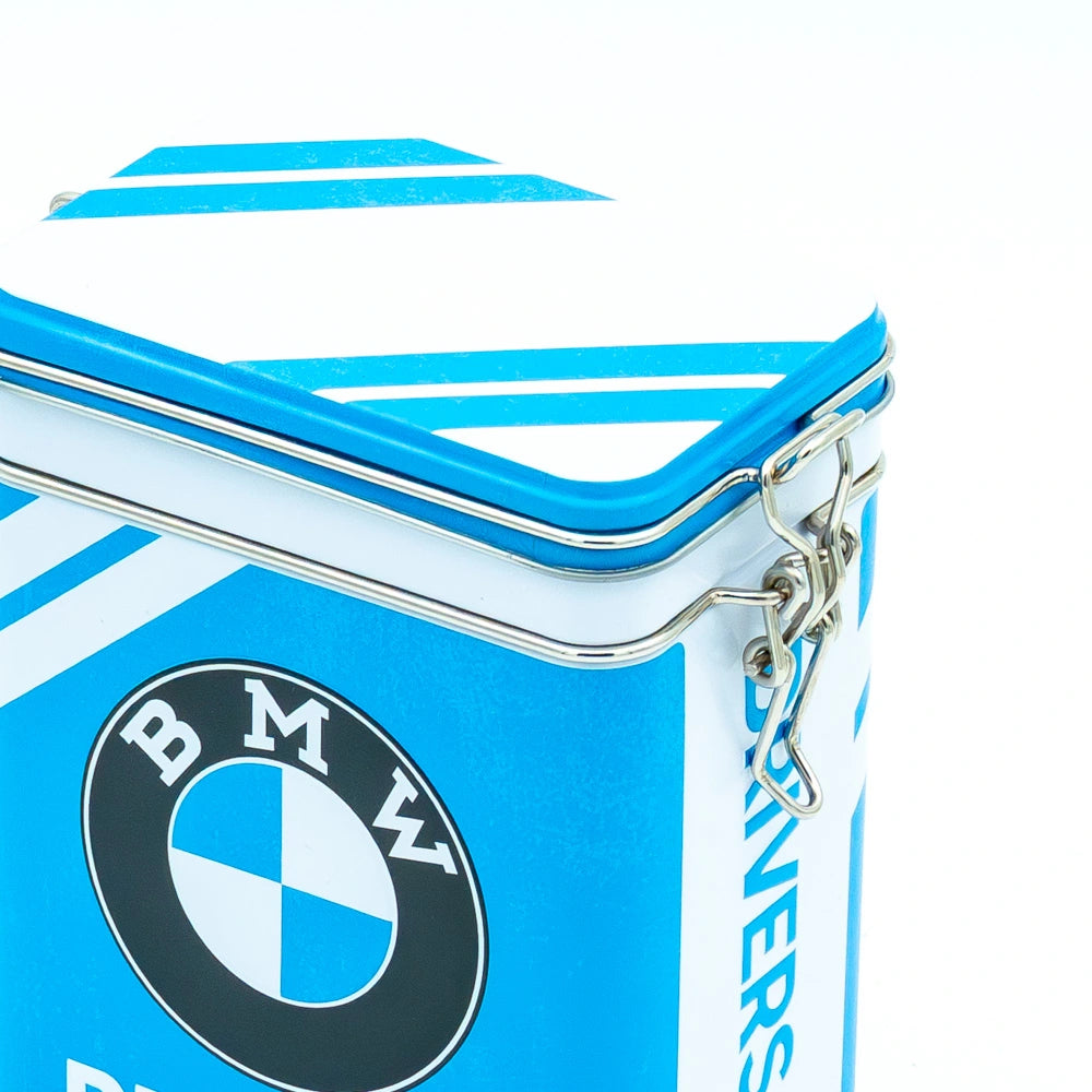 - Stevig metalen tinnen blik in BMW-blauw met vintage design