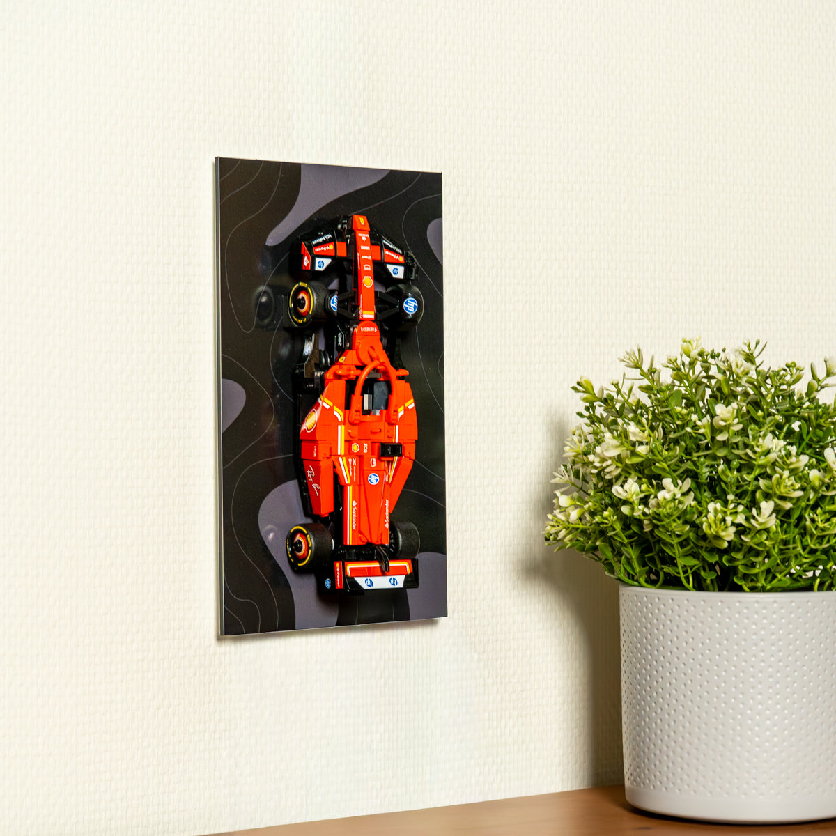 Dit display frame combineert functionaliteit met een artistiek design dat je LEGO Speed Champions auto naar een hoger niveau tilt. De zwarte achtergrond met grijze vlakken creëert een moderne en stijlvolle basis waarop je racewagen perfect uitkomt. Het frame is samengesteld uit twee aluminium platen met een kunststof tussenlaag, wat zorgt voor een solide constructie die je LEGO model veilig aan de muur houdt.