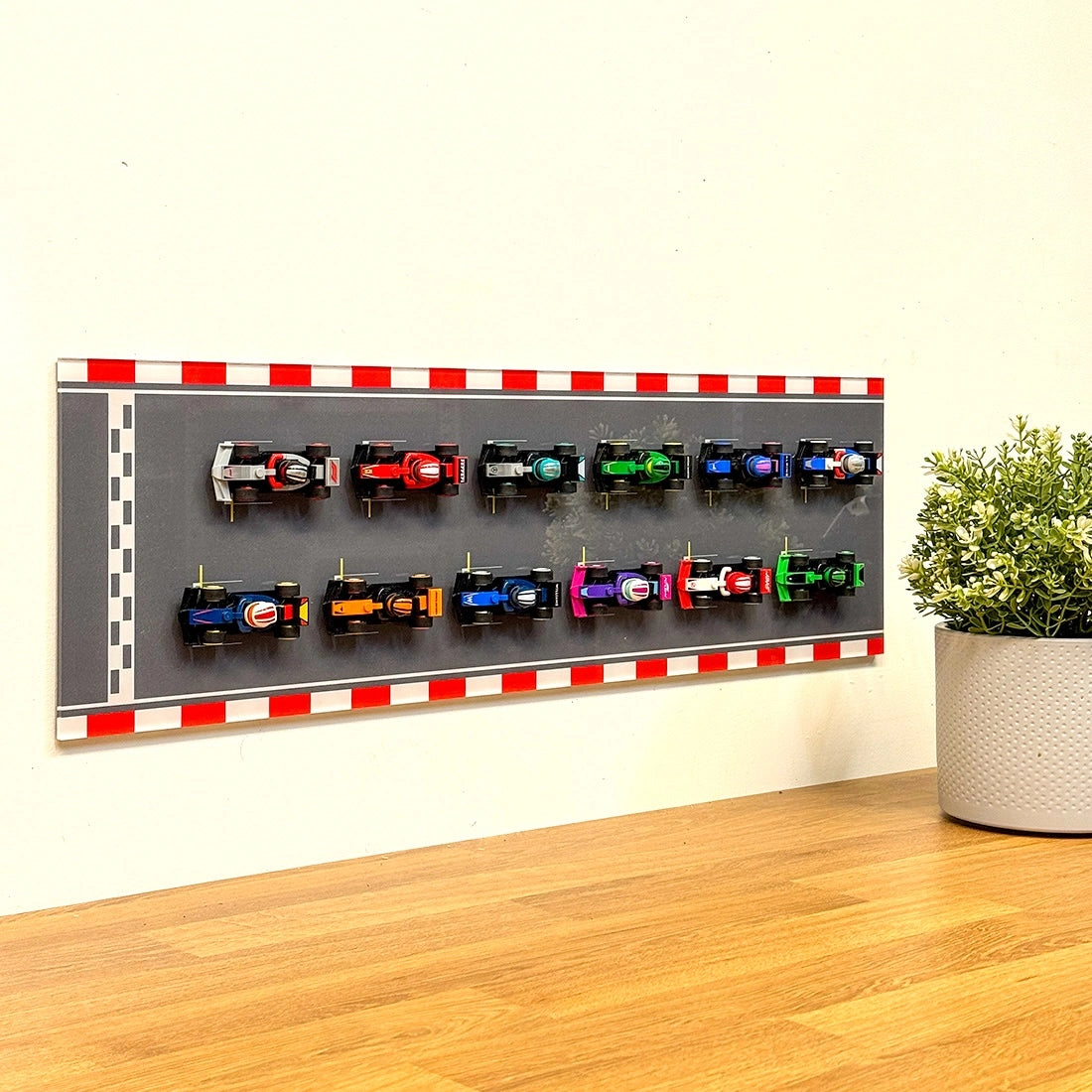 Selecteer een geschikte wandpositie waar je F1 minifiguren goed zichtbaar zijn. Zorg dat de muur vlak en stevig is voor een stabiele bevestiging.