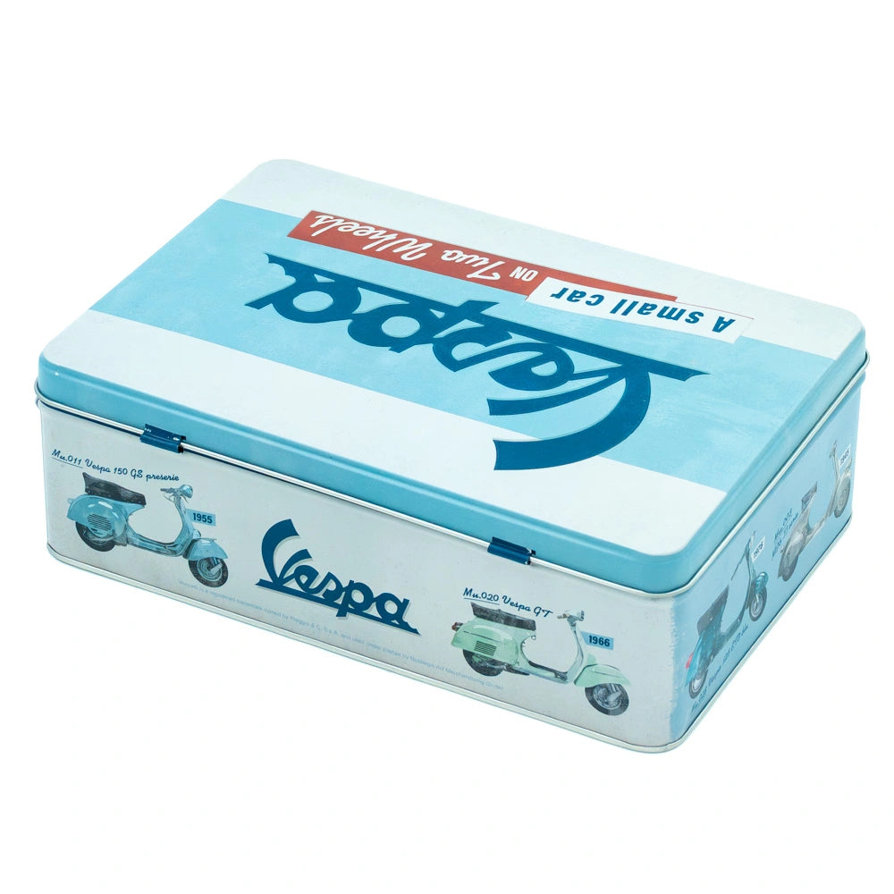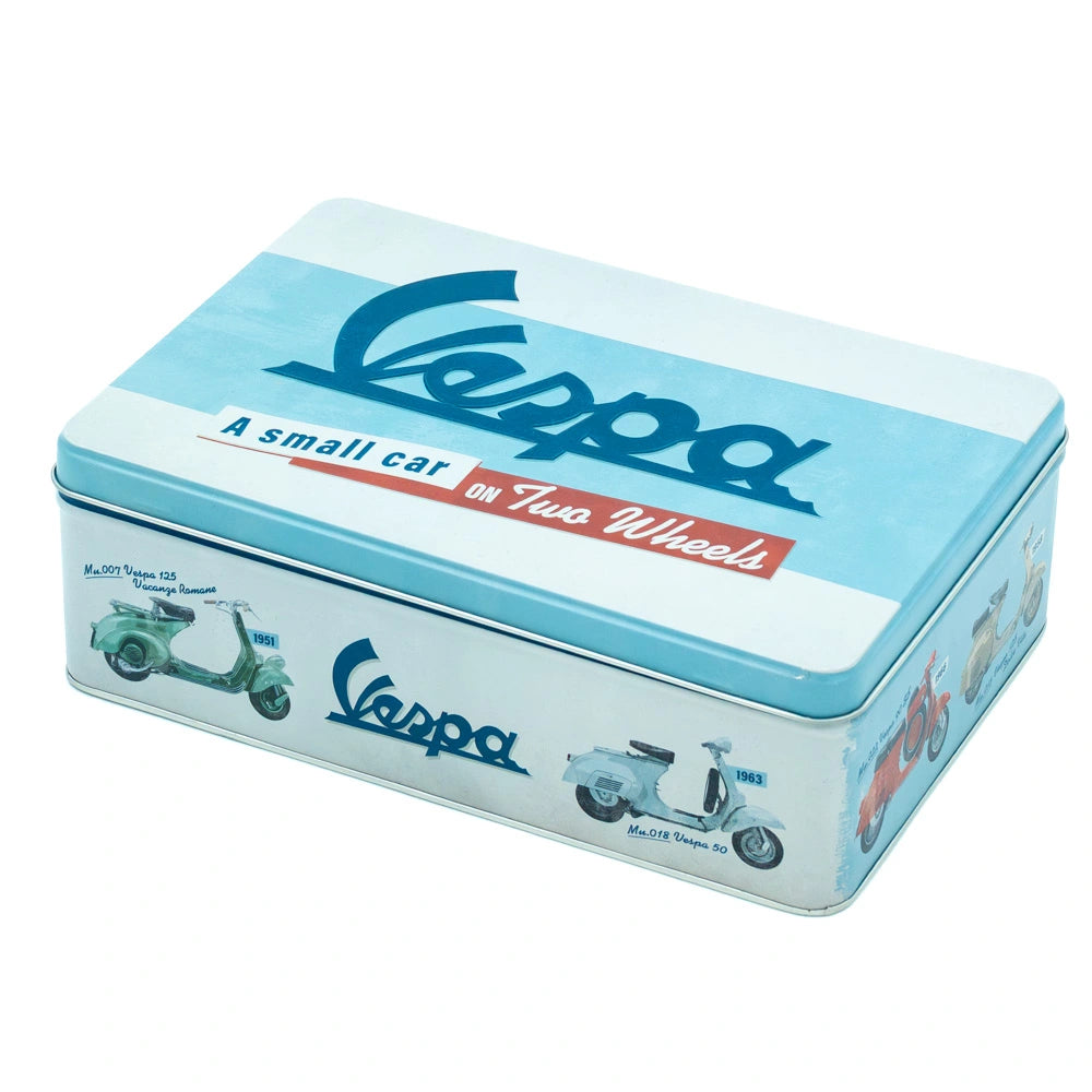 Bewaar je spullen met de iconische stijl van Vespa in dit Nostalgic-Art tinnen blik met de legendarische tekst "A Small Car On Two Wheels". Het blauw-witte metalen blik van 23 x 15,5 x 7,5 cm viert de vrijheid en elegantie van de Italiaanse scooter die generaties heeft geïnspireerd. Ideaal voor het opbergen van kleine items, herinneringen of persoonlijke spullen terwijl het tegelijkertijd de tijdloze charme van Vespa naar je garage, schuur of mancave brengt. De platte vorm past perfect in laden, op planken of in je scooter-hoek waar je georganiseerd wilt blijven met stijl.
